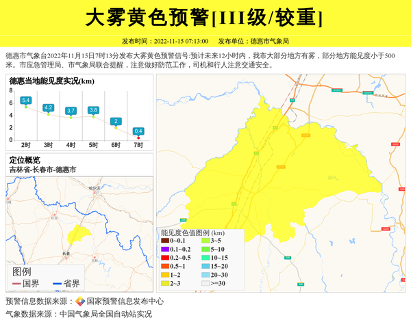 德惠市气象台2022年11月15日7时13分发布大雾黄色预警信号:预计未来12小时内,我市大部分地方有雾,部分地方能见度小于500米。市应急管理局、市气象局联合提醒,注意做好防范工作,司机和行人注意交通安全。 信息来源:国家预警信息发布中心; 发布单位:德惠市气象局。