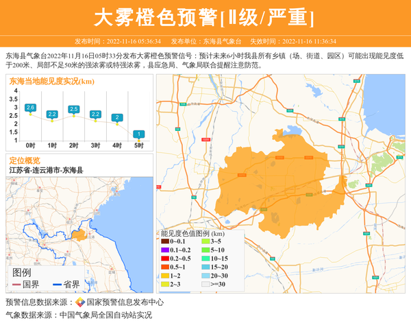 东海县气象台2022年11月16日05时33分发布大雾橙色预警信号:预计未来6小时我县所有乡镇(场、街道、园区)可能出现能见度低于200米、局部不足50米的强浓雾或特强浓雾,县应急局、气象局联合提醒注意防范。 信息来源:国家预警信息发布中心; 发布单位:东海县气象台。