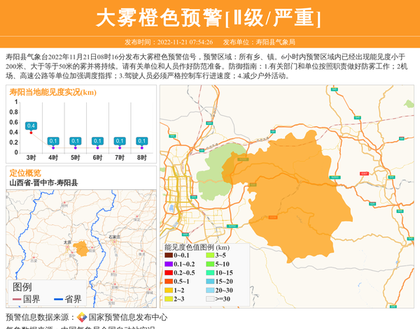 寿阳县气象台2022年11月21日08时16分发布大雾橙色预警信号,预警区域:所有乡、镇。6小时内预警区域内已经出现能见度小于200米、大于等于50米的雾并将持续。请有关单位和人员作好防范准备。防御指南:1.有关部门和单位按照职责做好防雾工作;2机场、高速公路等单位加强调度指挥;3.驾驶人员必须严格控制车行进速度;4.减少户外活动。 信息来源:国家预警信息发布中心; 发布单位:寿阳县气象局。