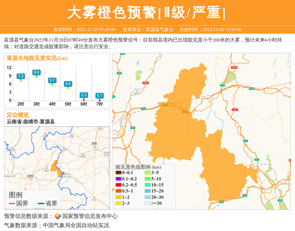 富源县气象台2022年11月20日07时49分发布大雾橙色预警信号:目前我县境内已出现能见度小于200米的大雾,预计未来6小时持续,对道路交通造成较重影响,请注意出行安全。 信息来源:国家预警信息发布中心; 发布单位:富源县气象台。