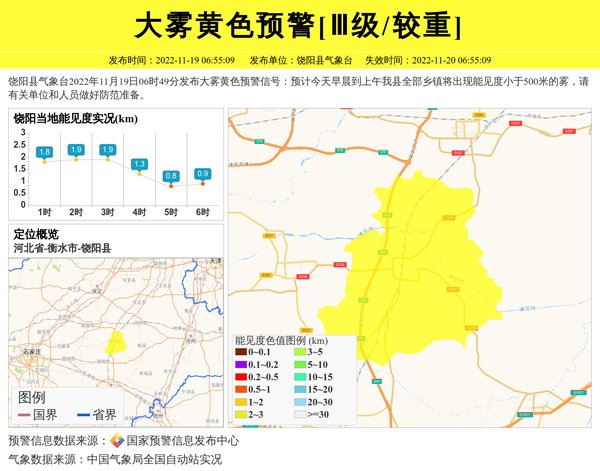 饶阳县气象台2022年11月19日06时49分发布大雾黄色预警信号:预计今天早晨到上午我县全部乡镇将出现能见度小于500米的雾,请有关单位和人员做好防范准备。 信息来源:国家预警信息发布中心; 发布单位:饶阳县气象台。