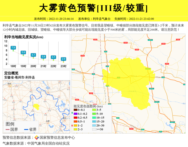 利辛县气象台2022年11月20日23时42分发布大雾黄色预警信号。目前我县望疃镇、中疃镇部分路段能见度已降至1-2千米,预计未来12小时内城北镇、旧城镇、望疃镇、中疃镇等大部分乡镇可能出现能见度小于500米的雾,局部能见度不足200米。请注意防范! 信息来源:国家预警信息发布中心; 发布单位:利辛县气象台。