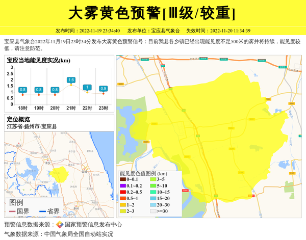 宝应县气象台2022年11月19日23时34分发布大雾黄色预警信号:目前我县各乡镇已经出现能见度不足500米的雾并将持续,能见度较低,请注意防范。 信息来源:国家预警信息发布中心; 发布单位:宝应县气象台。
