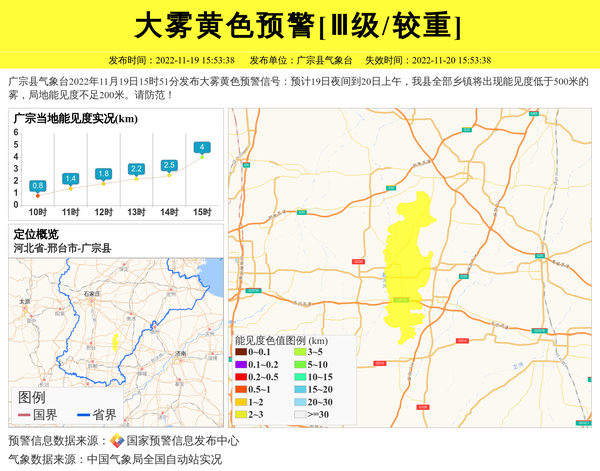 广宗县气象台2022年11月19日15时51分发布大雾黄色预警信号:预计19日夜间到20日上午,我县全部乡镇将出现能见度低于500米的雾,局地能见度不足200米。请防范! 信息来源:国家预警信息发布中心; 发布单位:广宗县气象台。