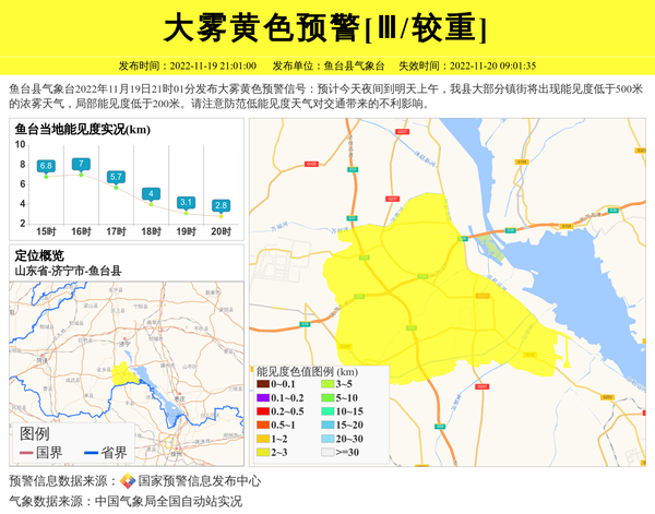 鱼台县气象台2022年11月19日21时01分发布大雾黄色预警信号:预计今天夜间到明天上午,我县大部分镇街将出现能见度低于500米的浓雾天气,局部能见度低于200米。请注意防范低能见度天气对交通带来的不利影响。 信息来源:国家预警信息发布中心; 发布单位:鱼台县气象台。