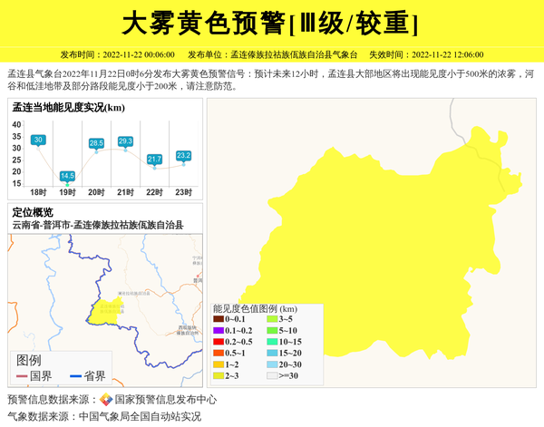孟连县气象台2022年11月22日0时6分发布大雾黄色预警信号:预计未来12小时,孟连县大部地区将出现能见度小于500米的浓雾,河谷和低洼地带及部分路段能见度小于200米,请注意防范。 信息来源:国家预警信息发布中心; 发布单位:孟连傣族拉祜族佤族自治县气象台。