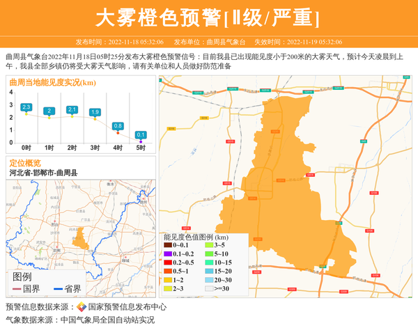 曲周县气象台2022年11月18日05时25分发布大雾橙色预警信号:目前我县已出现能见度小于200米的大雾天气,预计今天凌晨到上午,我县全部乡镇仍将受大雾天气影响,请有关单位和人员做好防范准备 信息来源:国家预警信息发布中心; 发布单位:曲周县气象台。