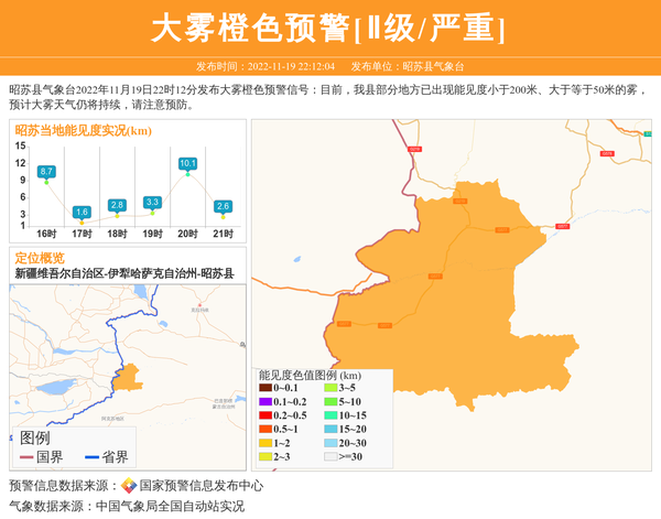 昭苏县气象台2022年11月19日22时12分发布大雾橙色预警信号:目前,我县部分地方已出现能见度小于200米、大于等于50米的雾,预计大雾天气仍将持续,请注意预防。 信息来源:国家预警信息发布中心; 发布单位:昭苏县气象台。