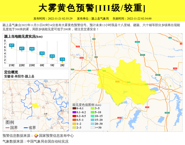 颍上县气象台2022年11月21日02时34分发布大雾黄色预警信号。预计未来12小时我县十八里铺、建颍、六十铺等部分乡镇将出现能见度低于500米的雾,局部乡镇能见度可低于200米,请注意交通安全! 信息来源:国家预警信息发布中心; 发布单位:颍上县气象局。