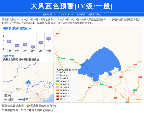 镶黄旗气象台2022年11月19日10时35分继续发布2022年11月18日10时29分发布的大风蓝色预警信号: 24小时内镶黄旗地区仍将受大风影响,平均风力可达6级以上,或者阵风7级以上。请有关单位和人员做好防范准备。 信息来源:国家预警信息发布中心; 发布单位:镶黄旗气象台。