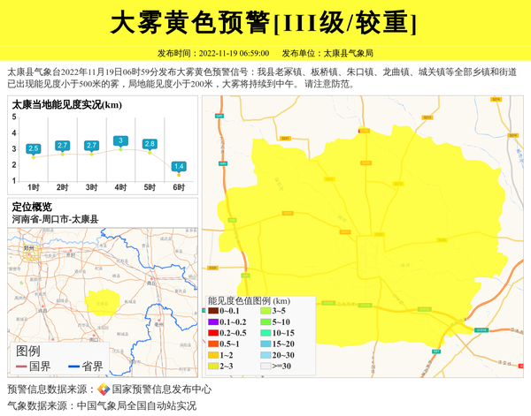 太康县气象台2022年11月19日06时59分发布大雾黄色预警信号:我县老冢镇、板桥镇、朱口镇、龙曲镇、城关镇等全部乡镇和街道已出现能见度小于500米的雾,局地能见度小于200米,大雾将持续到中午。 请注意防范。 信息来源:国家预警信息发布中心; 发布单位:太康县气象局。