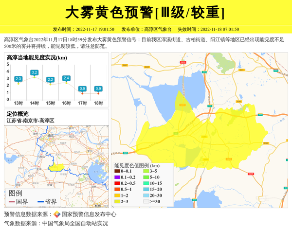 高淳区气象台2022年11月17日18时59分发布大雾黄色预警信号:目前我区淳溪街道、古柏街道、阳江镇等地区已经出现能见度不足500米的雾并将持续,能见度较低,请注意防范。 信息来源:国家预警信息发布中心; 发布单位:高淳区气象台。