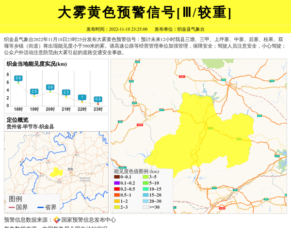 织金县气象台2022年11月18日23时25分发布大雾黄色预警信号:预计未来12小时我县三塘、三甲、上坪寨、中寨、后寨、桂果、双堰等乡镇(街道)将出现能见度小于500米的雾。请高速公路等经营管理单位加强管理,保障安全;驾驶人员注意安全,小心驾驶;公众户外活动注意防范由大雾引起的道路交通安全事故。 信息来源:国家预警信息发布中心; 发布单位:织金县气象台。