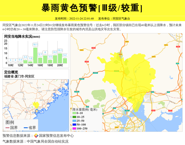 同安区气象台2022年11月24日22时01分继续发布暴雨黄色预警信号:过去6小时,我区部分镇街已出现40毫米以上强降水,预计未来6小时仍有20~30毫米降水。请注意防范强降水引发的城市内涝及山洪地灾等次生灾害。 信息来源:国家预警信息发布中心; 发布单位:同安区气象台。