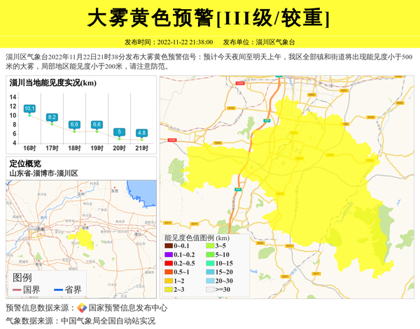 淄川区气象台2022年11月22日21时38分发布大雾黄色预警信号:预计今天夜间至明天上午,我区全部镇和街道将出现能见度小于500米的大雾,局部地区能见度小于200米,请注意防范。 信息来源:国家预警信息发布中心; 发布单位:淄川区气象台。