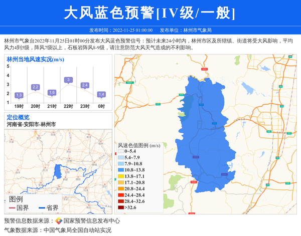 林州市气象台2022年11月25日01时00分发布大风蓝色预警信号:预计未来24小时内,林州市区及所辖镇、街道将受大风影响,平均风力4到5级,阵风7级以上,石板岩阵风8-9级,请注意防范大风天气造成的不利影响。 信息来源:国家预警信息发布中心; 发布单位:林州市气象局。