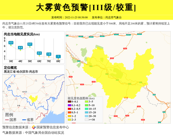 尚志市气象台11月25日8时50分发布大雾黄色预警信号:目前我市已出现能见度小于500米、局地不足200米的雾,预计雾将持续至上午,请注意防范。 信息来源:国家预警信息发布中心; 发布单位:尚志市气象台。