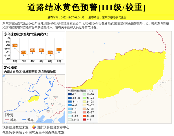 东乌珠穆沁旗气象台2022年11月27日08时05分继续发布2022年11月26日20时05分发布的道路结冰黄色预警信号:12小时内东乌珠穆沁旗可能出现对交通有影响的道路结冰。请有关单位和人员做好防范准备。 信息来源:国家预警信息发布中心; 发布单位:东乌珠穆沁旗气象台。