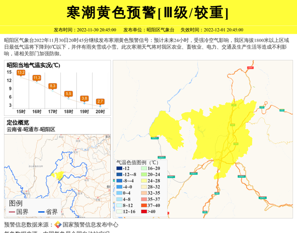 昭阳区气象台2022年11月30日20时45分继续发布寒潮黄色预警信号:预计未来24小时,受强冷空气影响,我区海拔1800米以上区域日最低气温将下降到0℃以下,并伴有雨夹雪或小雪。此次寒潮天气将对我区农业、畜牧业、电力、交通及生产生活等造成不利影响,请相关部门加强防御。 信息来源:国家预警信息发布中心; 发布单位:昭阳区气象台。