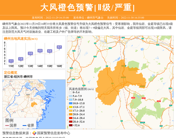 嵊州市气象台2022年11月29日16时35分将大风黄色预警信号升级为大风橙色预警信号:受寒潮影响,我市仙岩、金庭等镇已出现8级及以上阵风。预计今天傍晚到明天我市所有乡(镇、街道)将出现7~9级偏北大风,其中仙岩、金庭等镇局部可出现10级阵风,请注意防范大风天气对设施农业、在建工程及户外广告牌等的不利影响。 信息来源:国家预警信息发布中心; 发布单位:嵊州市气象台。