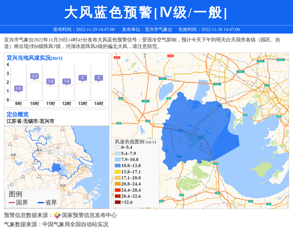 宜兴市气象台2022年11月29日14时45分发布大风蓝色预警信号:受强冷空气影响,预计今天下午到明天白天我市各镇(园区、街道)将出现5到6级阵风7级,河湖水面阵风8级的偏北大风,请注意防范。 信息来源:国家预警信息发布中心; 发布单位:宜兴市气象台。