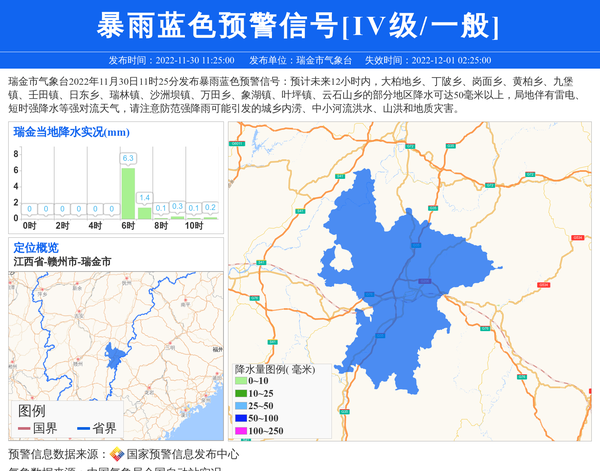 瑞金市气象台2022年11月30日11时25分发布暴雨蓝色预警信号:预计未来12小时内,大柏地乡、丁陂乡、岗面乡、黄柏乡、九堡镇、壬田镇、日东乡、瑞林镇、沙洲坝镇、万田乡、象湖镇、叶坪镇、云石山乡的部分地区降水可达50毫米以上,局地伴有雷电、短时强降水等强对流天气,请注意防范强降雨可能引发的城乡内涝、中小河流洪水、山洪和地质灾害。 信息来源:国家预警信息发布中心; 发布单位:瑞金市气象台。