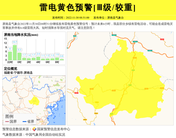 屏南县气象台2022年11月30日08时51分继续发布雷电黄色预警信号:预计未来6小时,我县部分乡镇有雷电活动,可能会造成雷电灾害事故并伴有6-8级雷雨大风、短时强降水等强对流天气。请注意防范! 信息来源:国家预警信息发布中心; 发布单位:屏南县气象台。