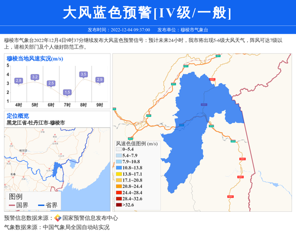 穆棱市气象台2022年12月4日9时37分继续发布大风蓝色预警信号:预计未来24小时,我市将出现5-6级大风天气,阵风可达7级以上,请相关部门及个人做好防范工作。 信息来源:国家预警信息发布中心; 发布单位:穆棱市气象台。
