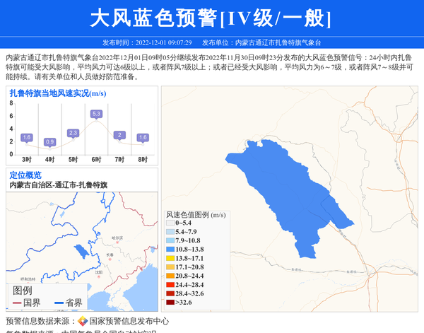 内蒙古通辽市扎鲁特旗气象台2022年12月01日09时05分继续发布2022年11月30日09时23分发布的大风蓝色预警信号:24小时内扎鲁特旗可能受大风影响,平均风力可达6级以上,或者阵风7级以上;或者已经受大风影响,平均风力为6~7级,或者阵风7~8级并可能持续。请有关单位和人员做好防范准备。 信息来源:国家预警信息发布中心; 发布单位:内蒙古通辽市扎鲁特旗气象台。