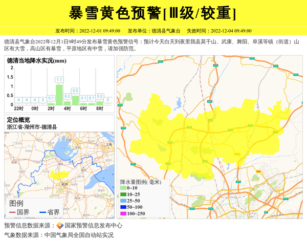 德清县气象台2022年12月1日9时49分发布暴雪黄色预警信号:预计今天白天到夜里我县莫干山、武康、舞阳、阜溪等镇(街道)山区有大雪,高山区有暴雪,平原地区有中雪,请加强防范。 信息来源:国家预警信息发布中心; 发布单位:德清县气象台。